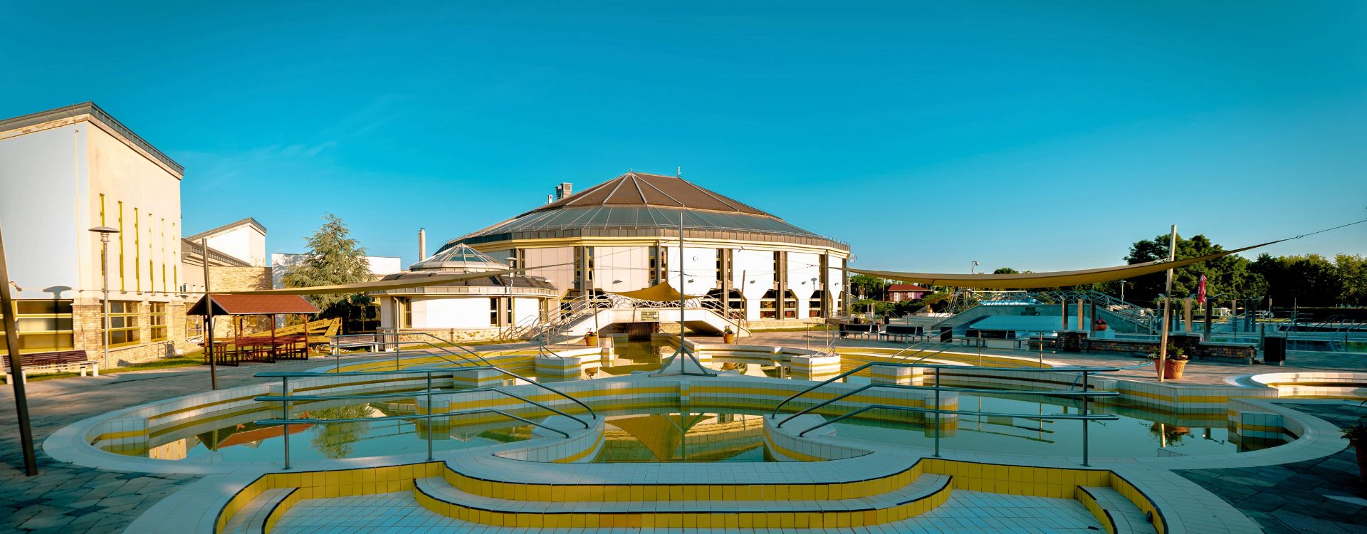 Bazin exterior cu apă termală: 32–34 °C (accesibil din interiorul clădirii)