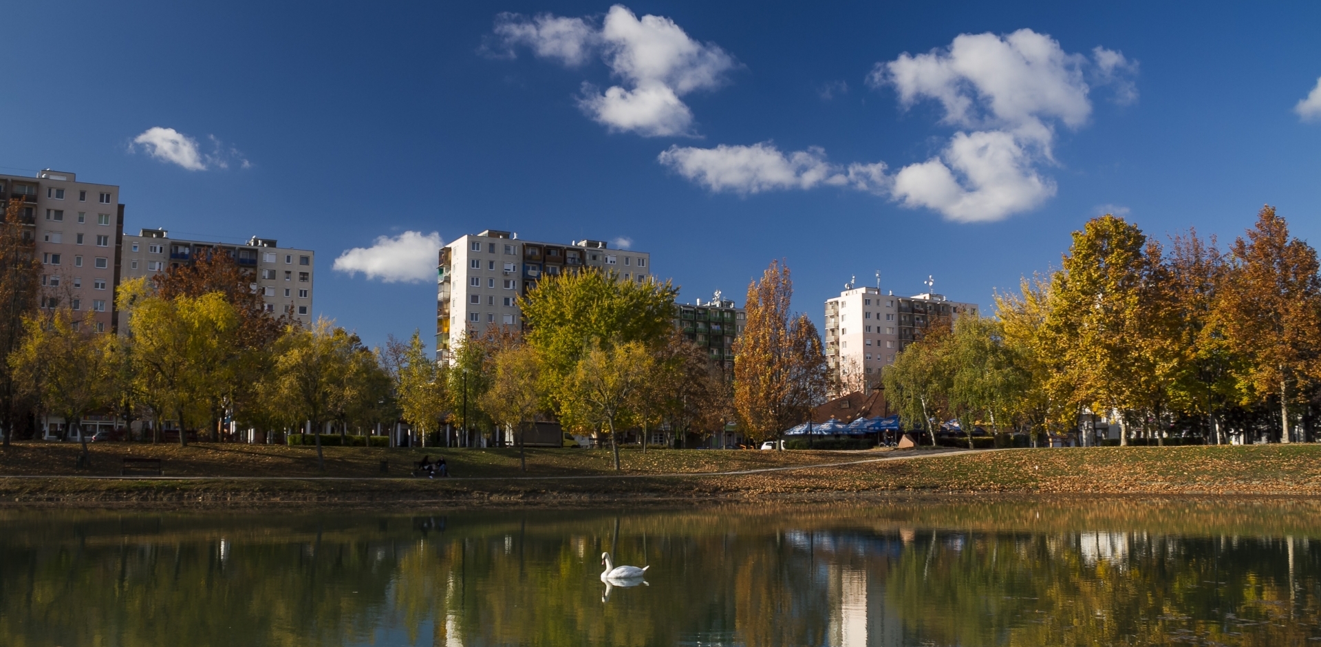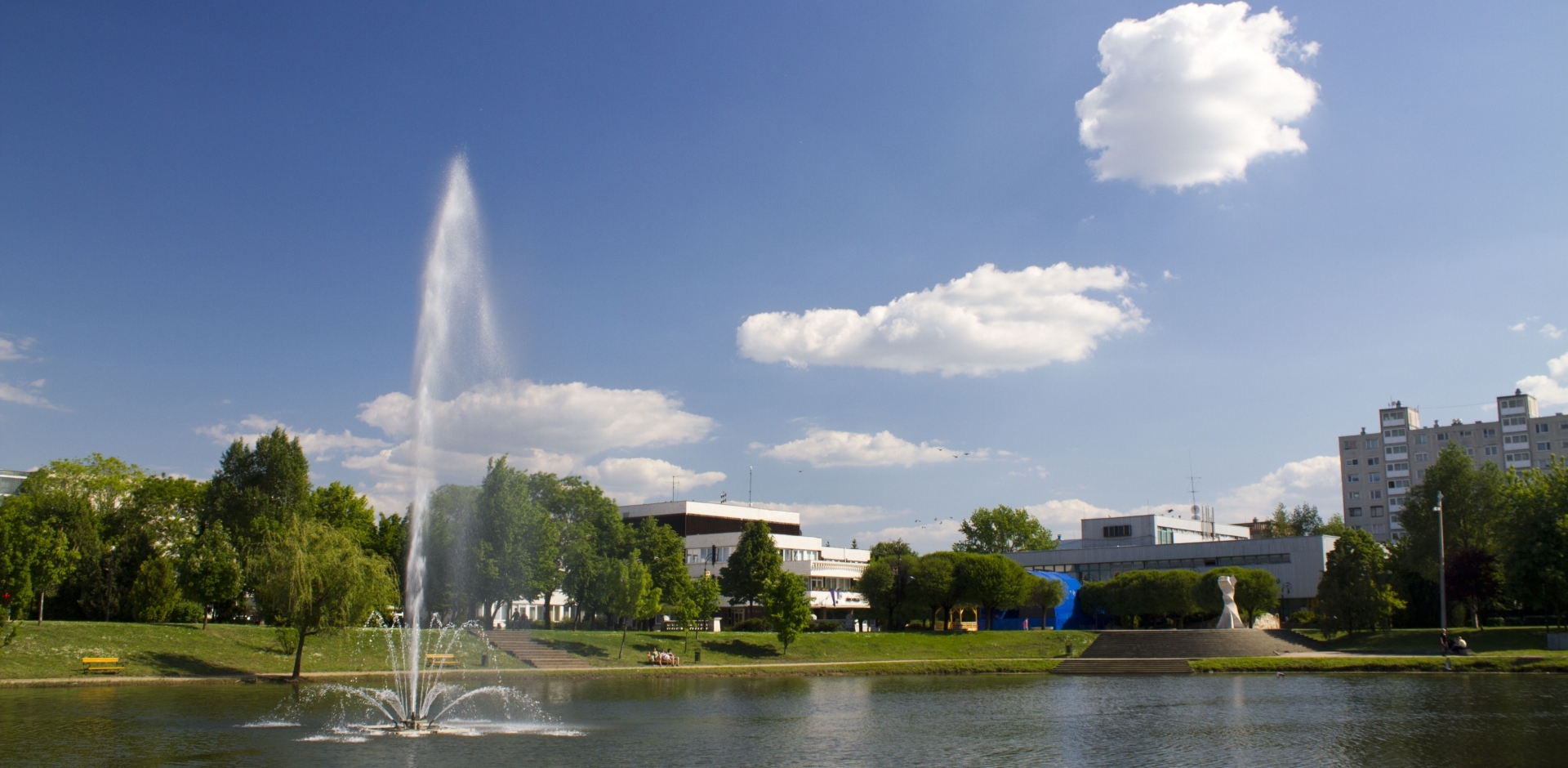 Promenáda v centre mesta Tiszaújváros okolo jazera Dísztó…